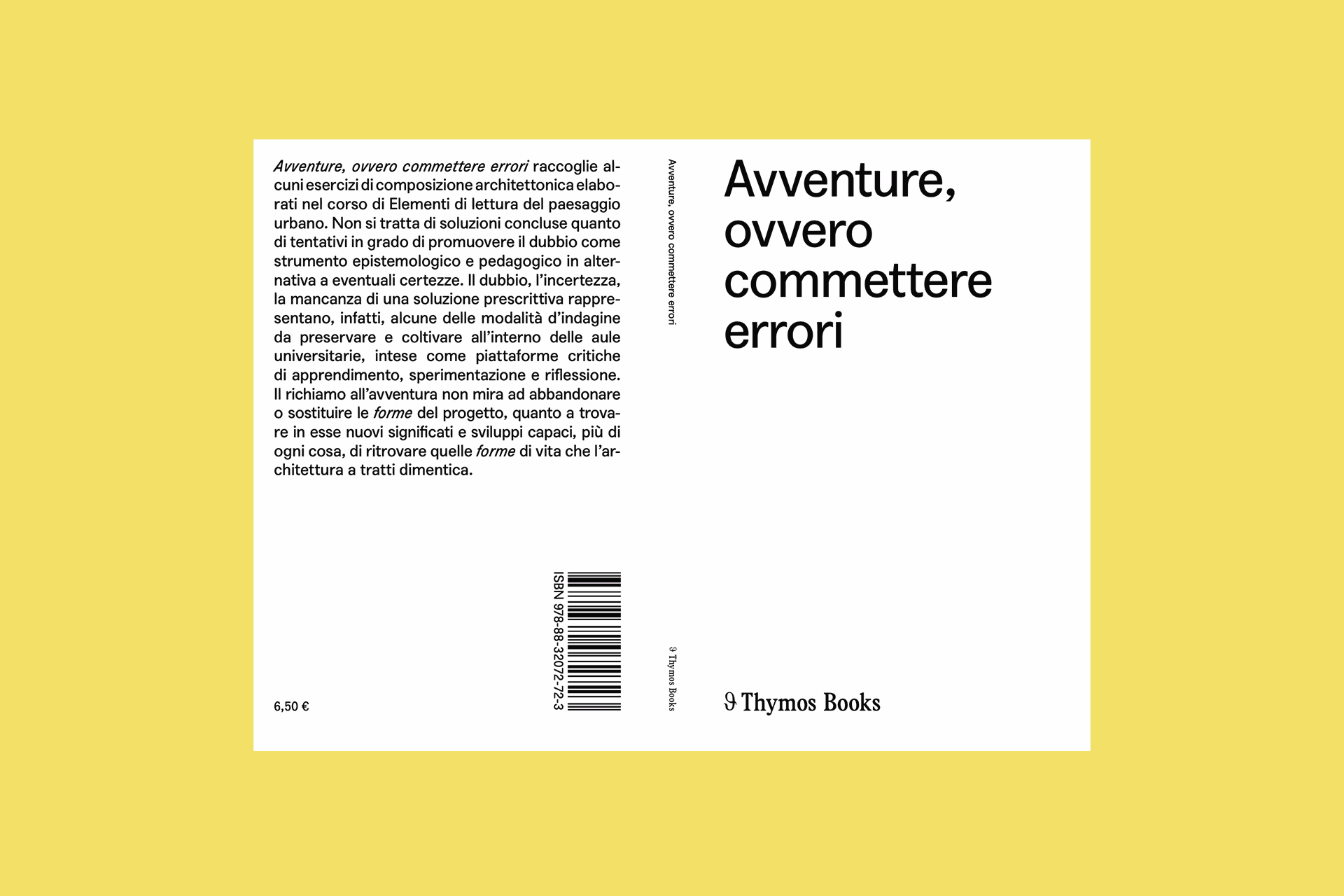 Avventure, ovvero commettere errori raccoglie alcuni esercizi di composizione architettonica elaborati nel corso di Elementi di lettura del paesaggio urbano. Non si tratta di soluzioni concluse quanto di tentativi in grado di promuovere il dubbio come strumento epistemologico e pedagogico in alternativa a eventuali certezze. Il dubbio, l’incertezza, la mancanza di una soluzione prescrittiva rappresentano, infatti, alcune delle modalità d’indagine da preservare e coltivare all’interno delle aule universitarie, intese come piattaforme critiche di apprendimento, sperimentazione e riflessione. Il richiamo all’avventura non mira ad abbandonare o sostituire le forme del progetto, quanto a trovare in esse nuovi significati e sviluppi capaci, più di ogni cosa, di ritrovare quelle forme di vita che l’architettura a tratti dimentica.